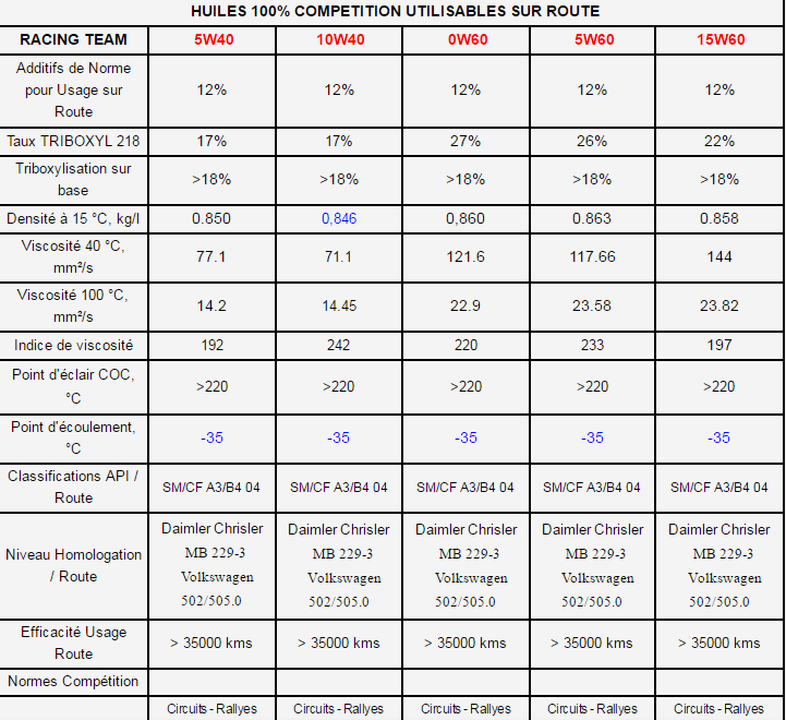 10W60 et 10W50 (avec chauffe moteur au démarrage)